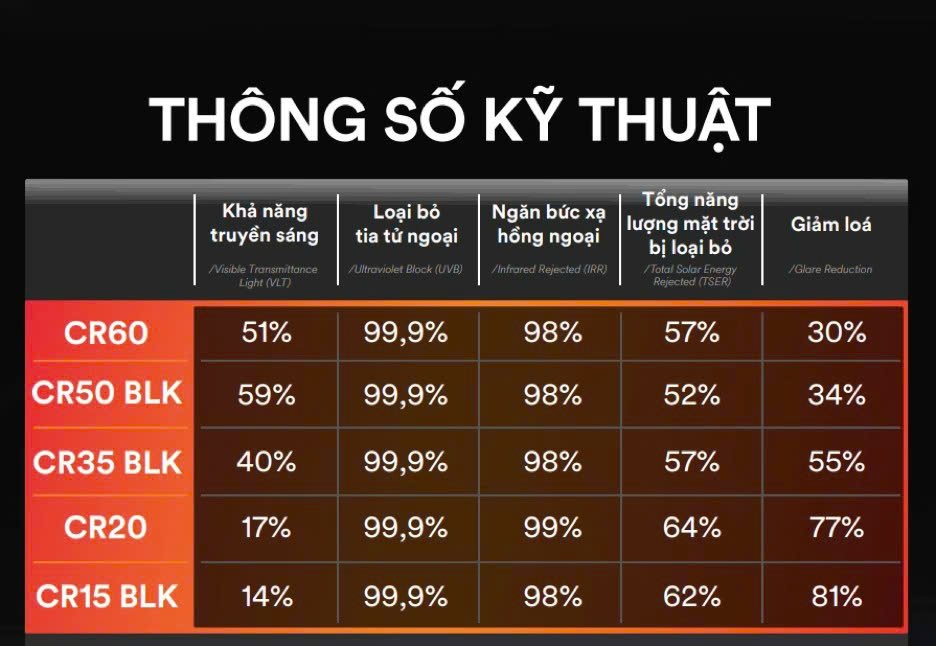 Đây là lựa chọn đầu tiên chủ xe có thể tham khảo. So với phim cách nhiệt 3M Crystalline kính lái, CR40 với tổng năng lượng mặt trời được loại bỏ và tỉ lệ giảm lóa cao hơn. Ngược lại, màu phim tối hơn và tỉ lệ truyền sáng thấp hơn.